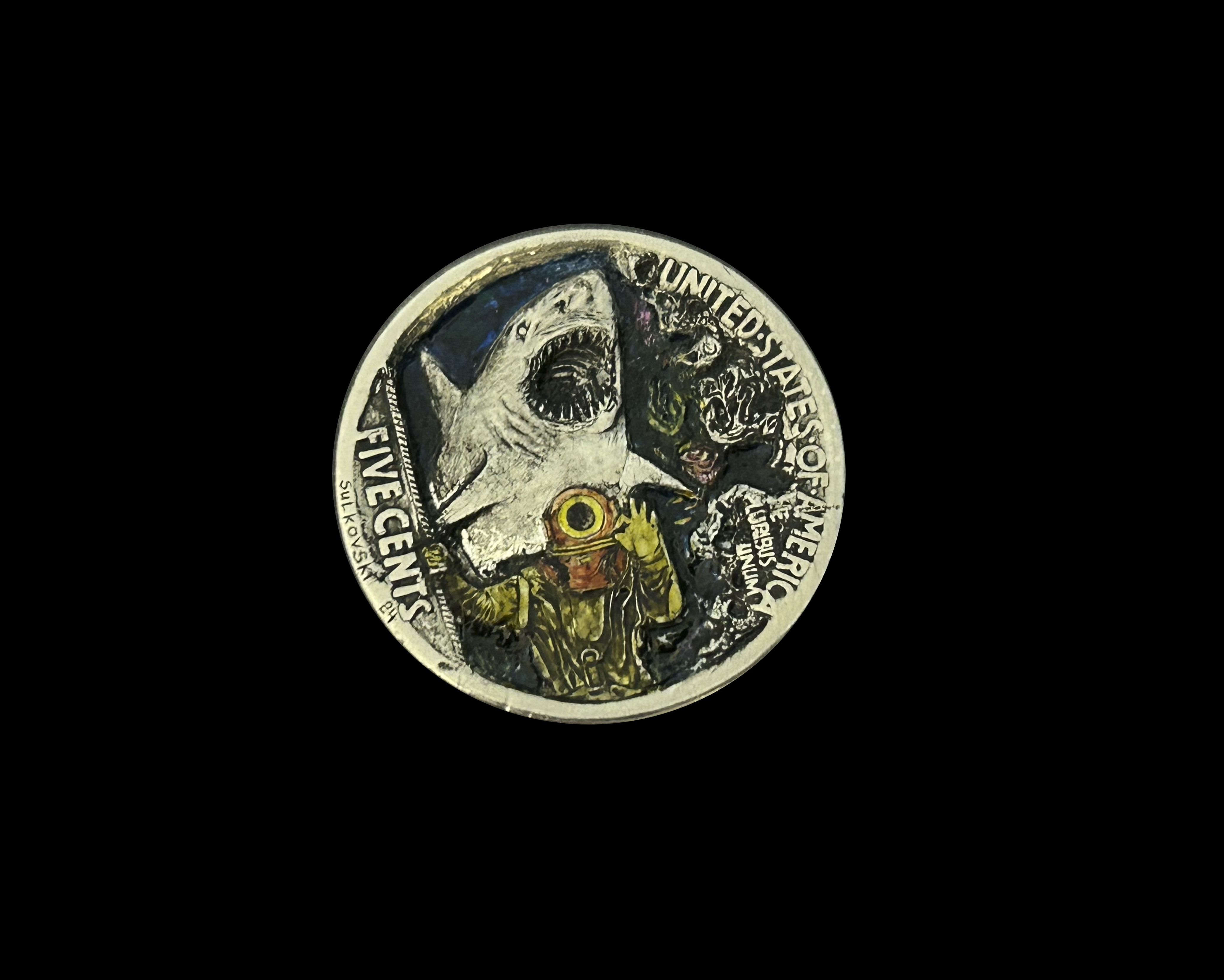 Hobo nickel coin carving Buffalo Nickel Shark vs Diver in Sea engraving and painting.