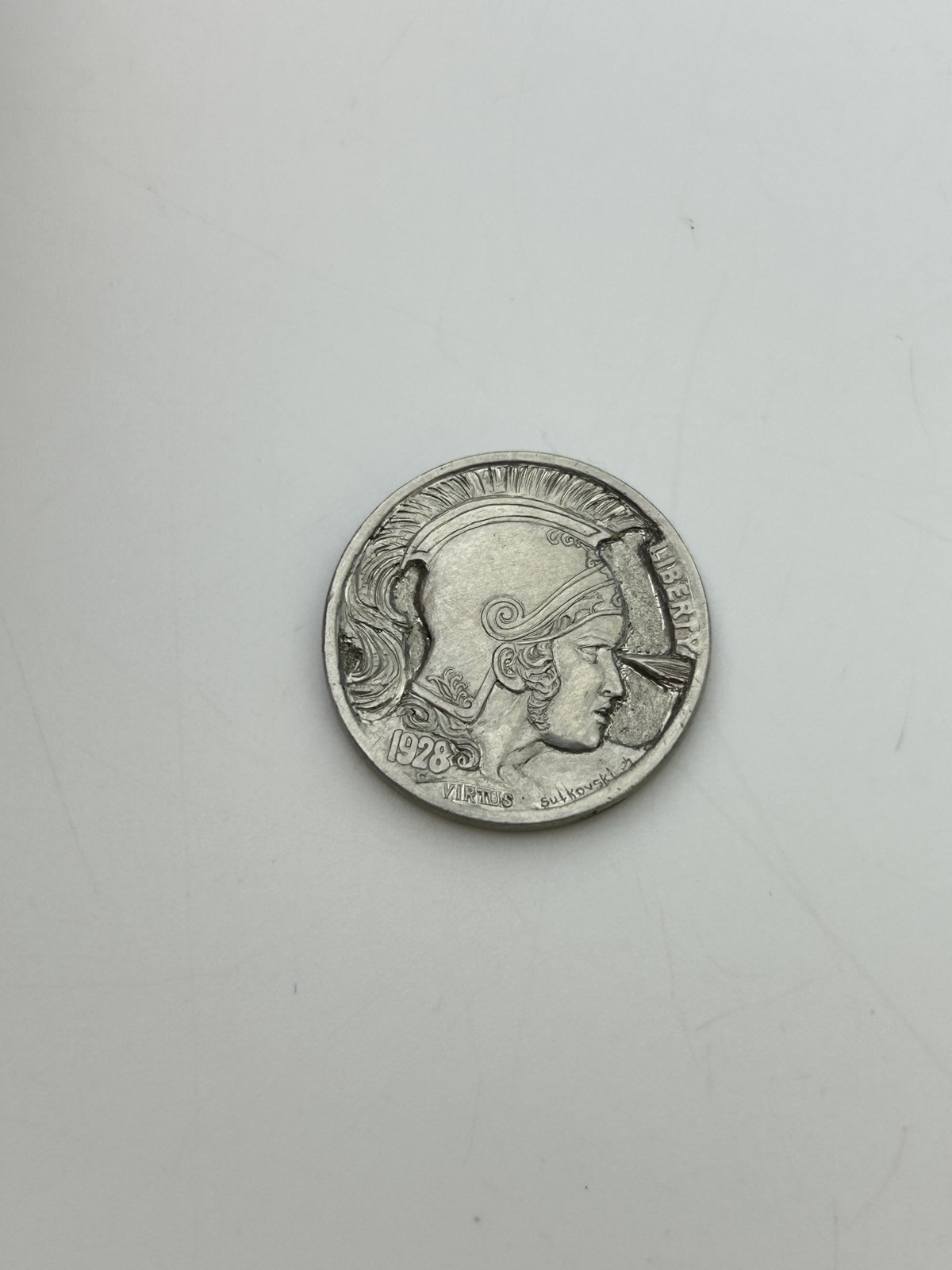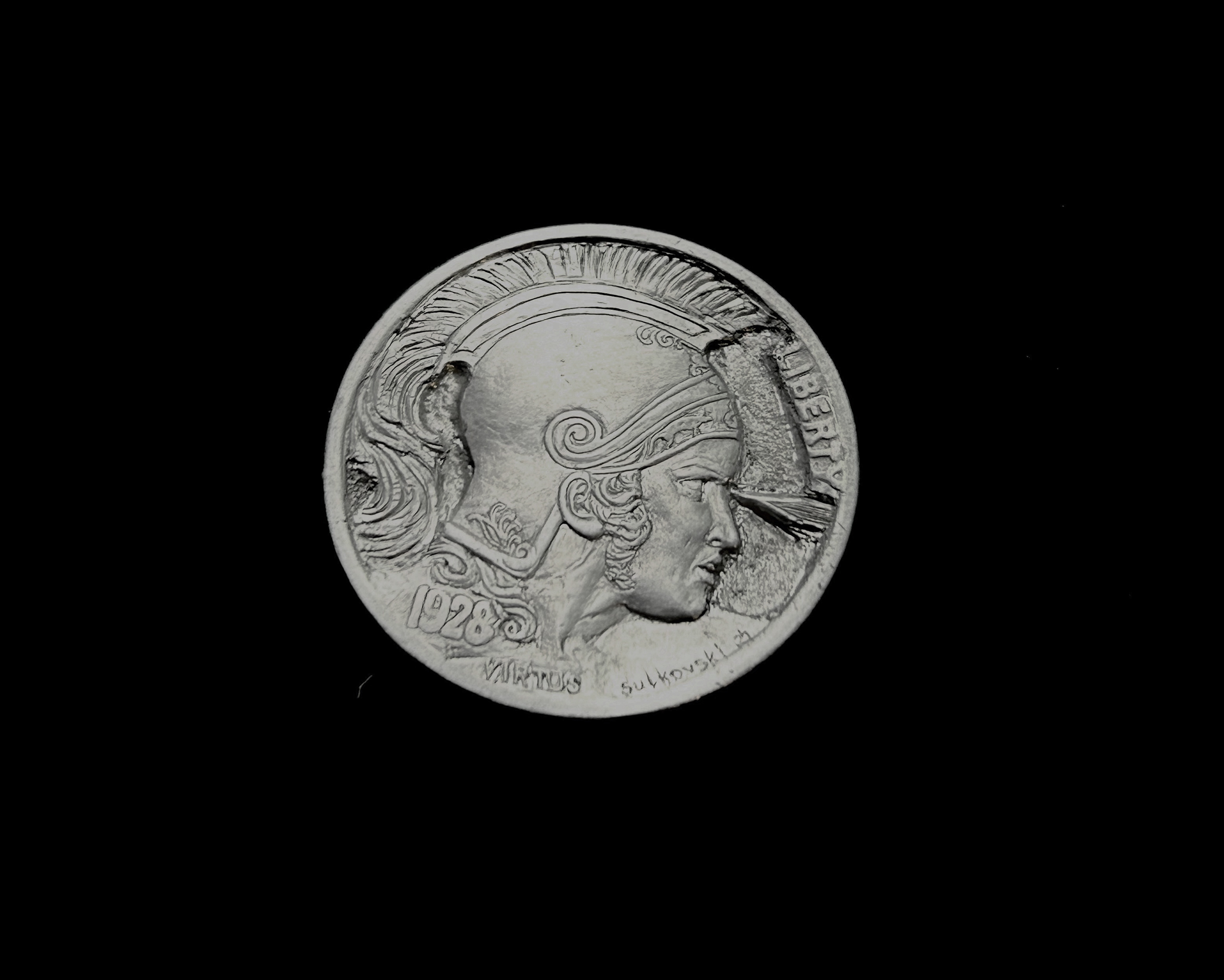 Hand carved on the coin "Five cent buffalo". Rome warrior portrait. Artist- Alex Sulkovski.