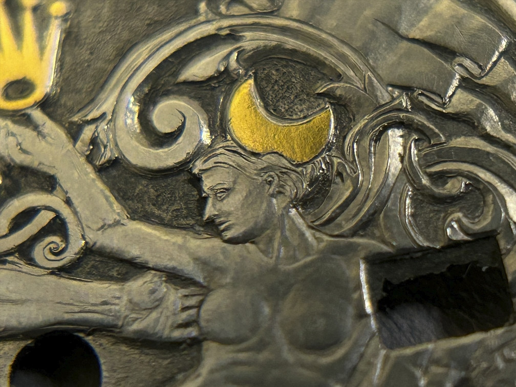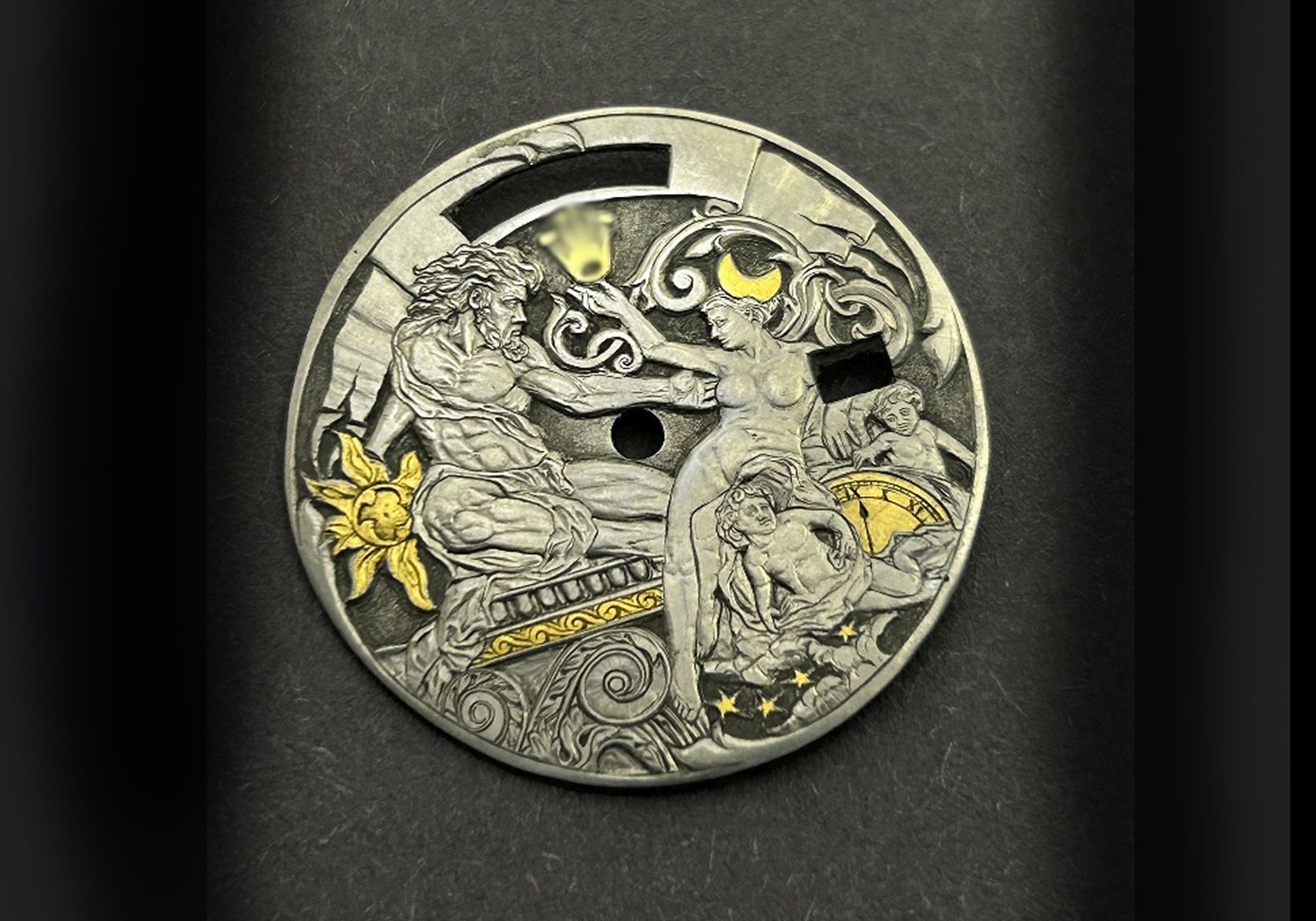 DESCRIPTION: The timepiece stands out for its meticulously crafted, individually made titanium dial with 24 k gold inlay. . The hand engraving transforms this classic Daydate dial a truly unique collector’s piece.