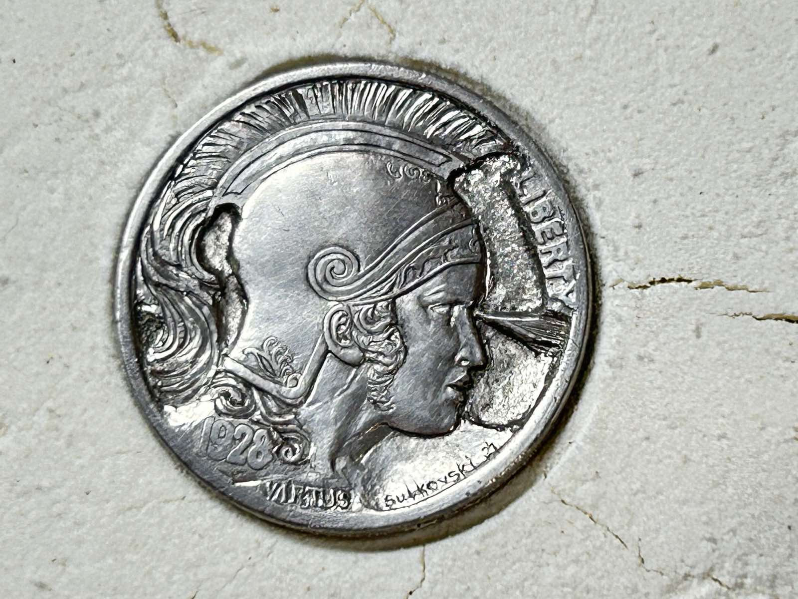 Hand carved on the coin "Five cent buffalo". Rome warrior portrait. Artist- Alex Sulkovski.