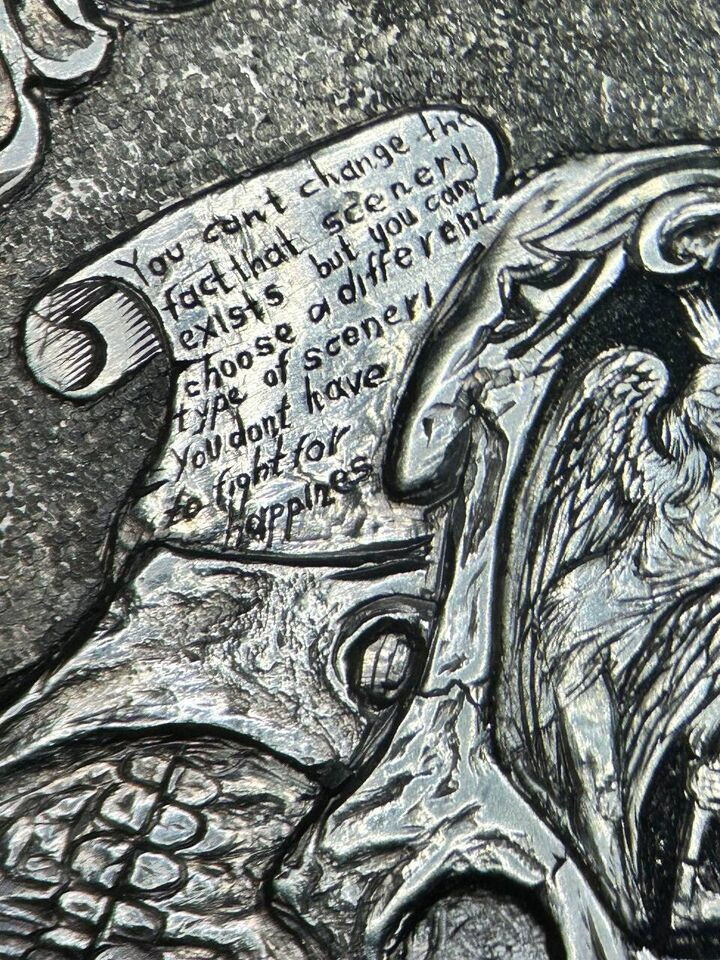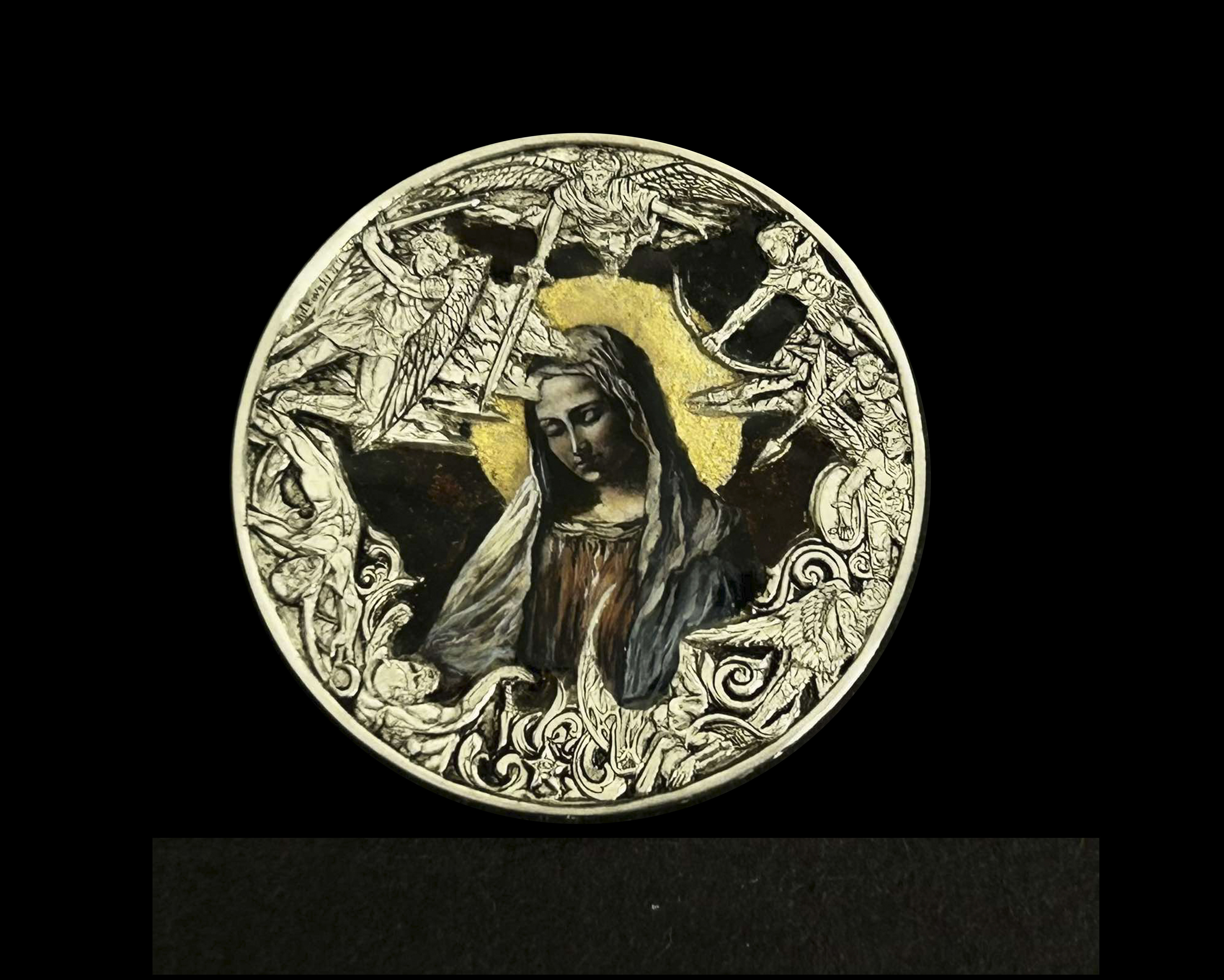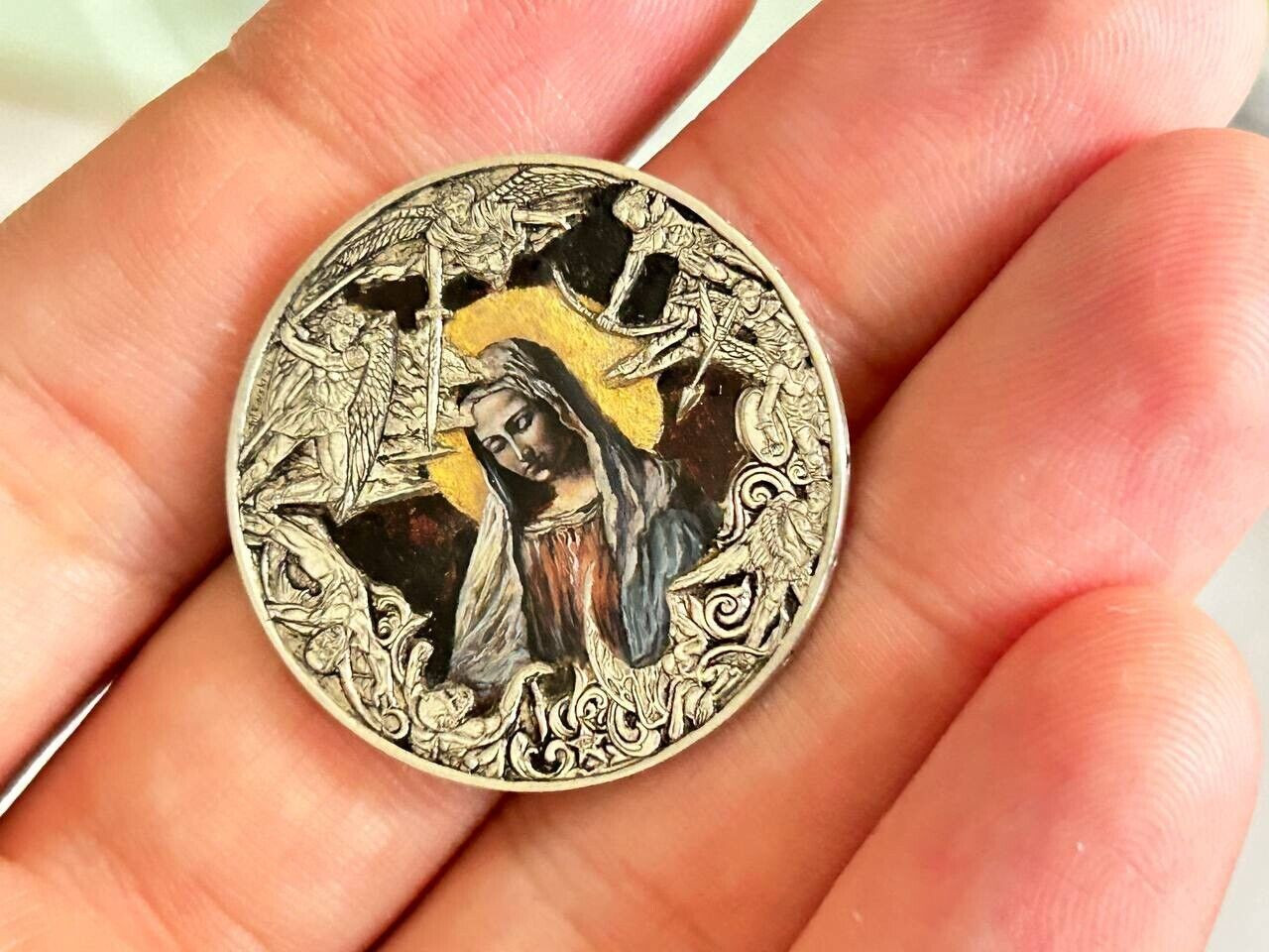 coin carving and painting. Mary and angels