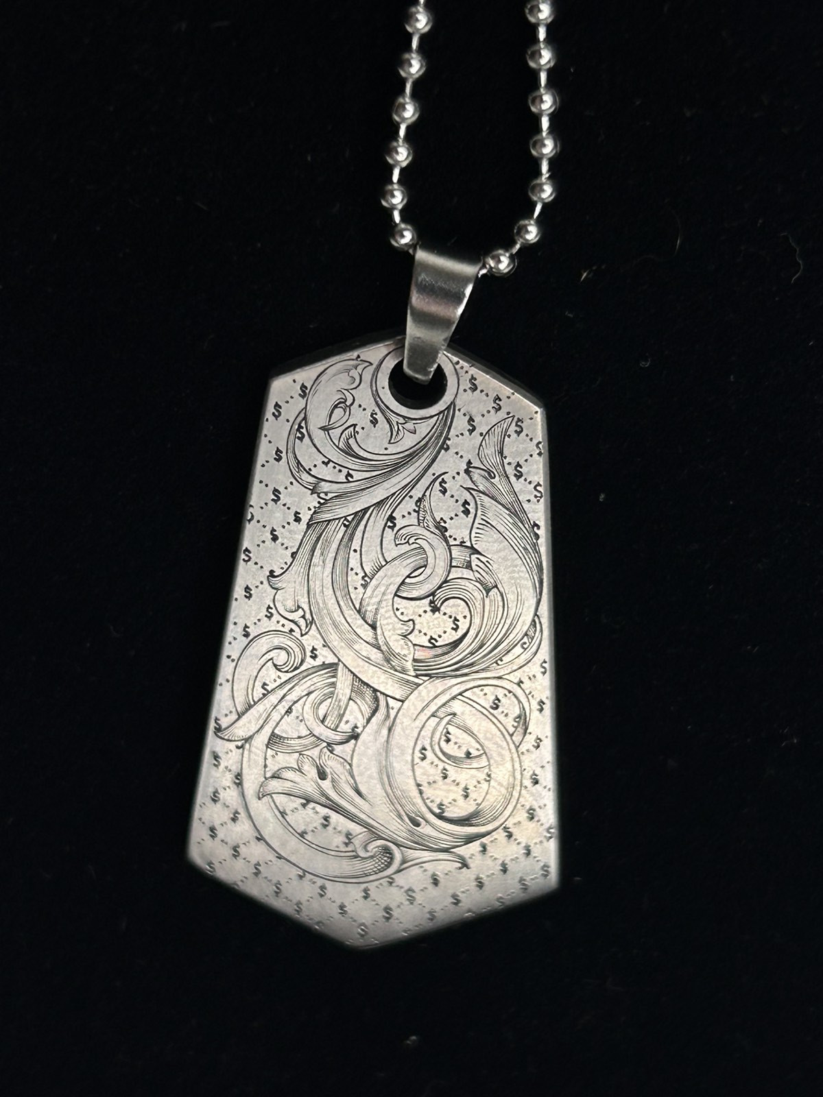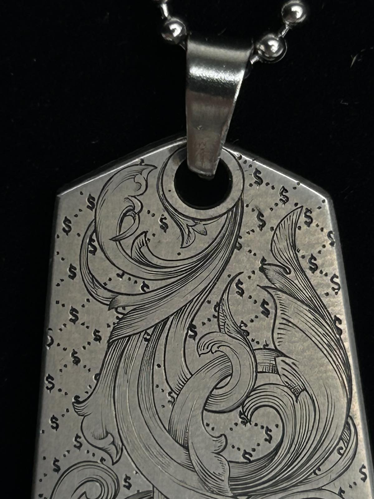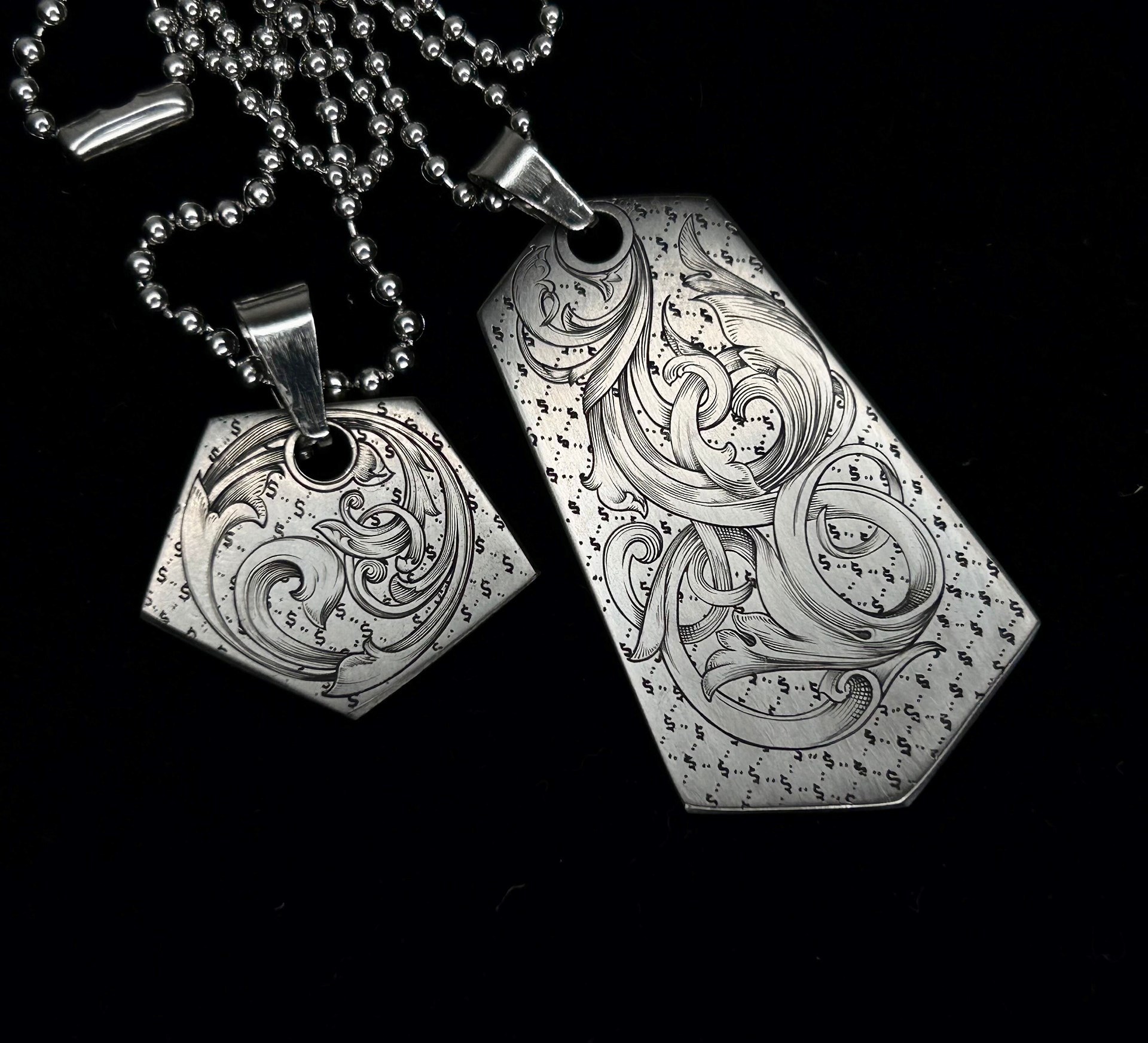 DESCRIPTION: This exquisite pendant is a true masterpiece, meticulously crafted with hand engraving and intricate scroll ornamentation. This pendant is sure to capture the attention of anyone who sees it.
