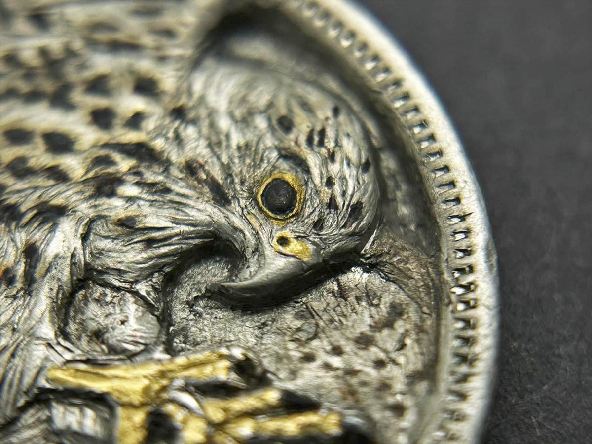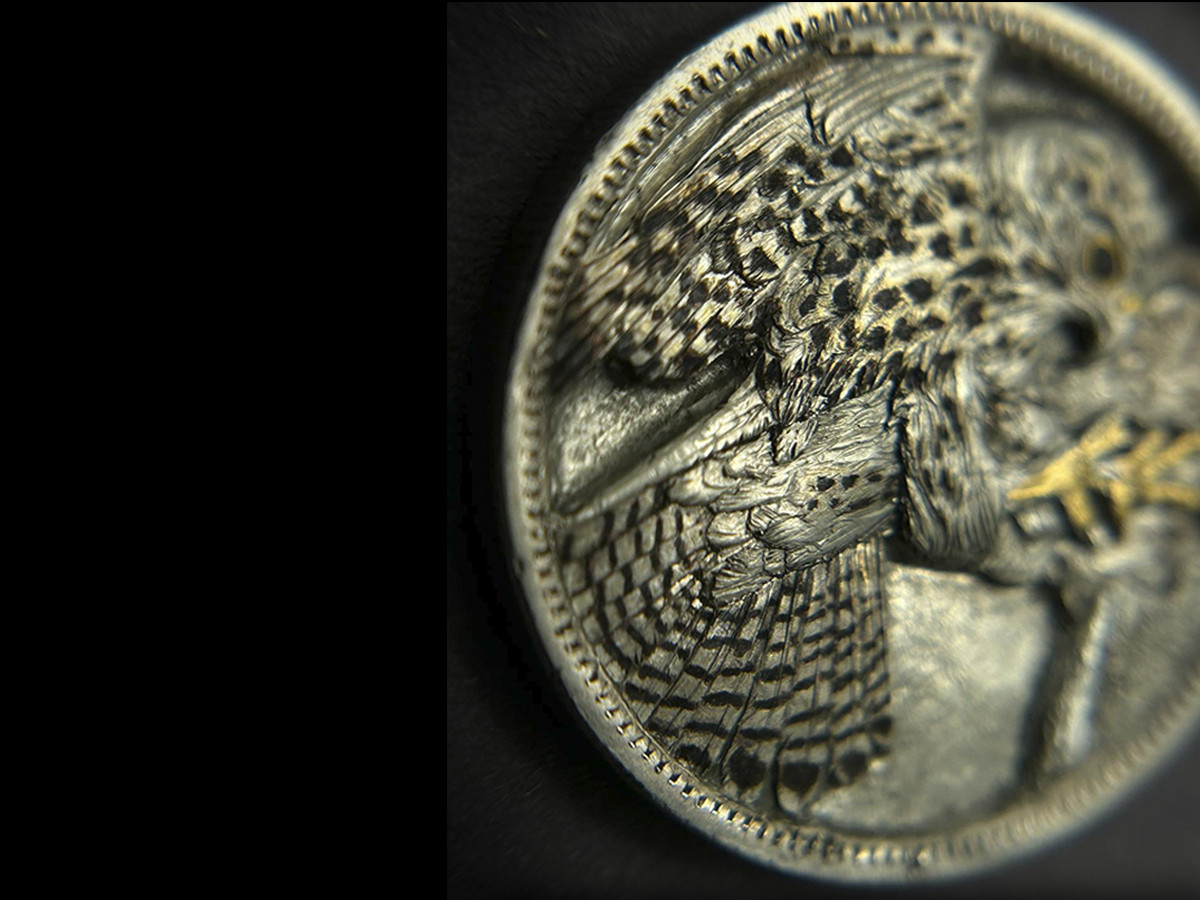 Hand carved on the 2 shilling 1948 coin. with 24 k gold inlay. Arabian Falcon.